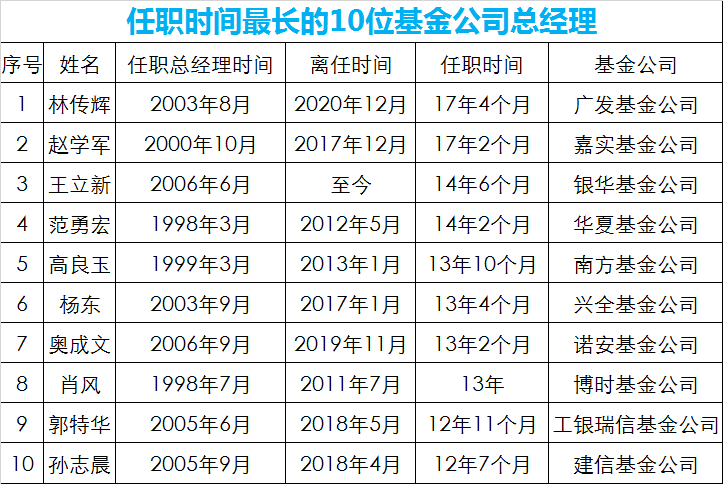 任职时间在14年左右的还有银华基金现任总经理王立新,华夏基金原总经理范勇宏,南方基金公司原总经理高良玉。其他任职时间前十的还有兴全、诺安、博时、工银瑞信、建信基金公司原总经理,包括了杨东、奥成文、肖风、郭特华、孙志晨等基金业大佬。