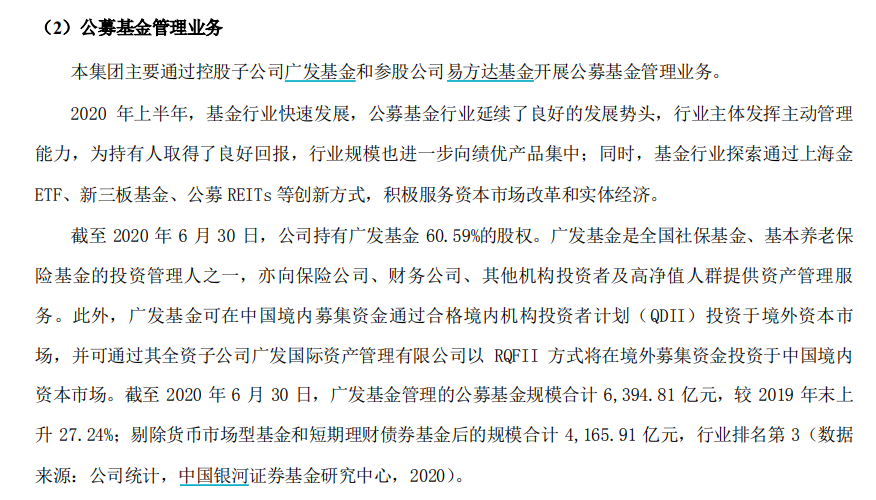 广发证券2020年半年报显示,广发基金公募基金资产规模已经接近6400亿元,半年增长27.24%;扣除货币和短期理财的规模为4165.91亿元,基金行业排名第三。