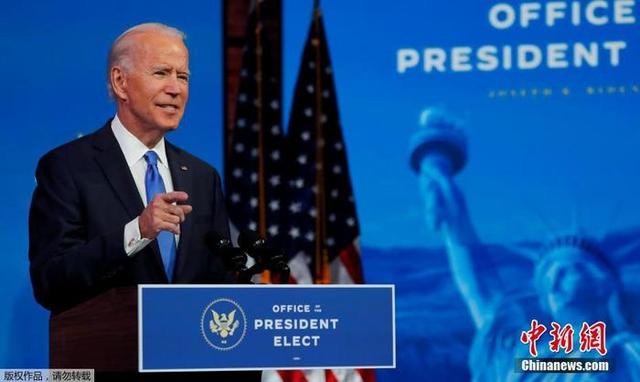 当地时间12月14日,美国选举团正式确认拜登在2020年美国总统大选中击败特朗普后,美国当选总统拜登在特拉华州威尔明顿皇后剧院的过渡总部发表电视讲话。