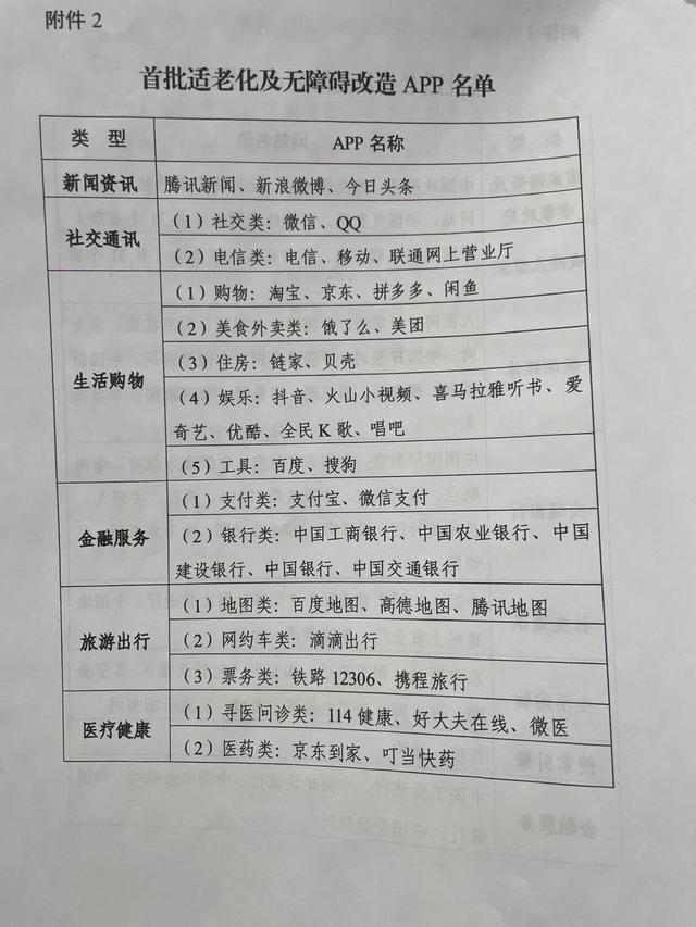 首批适老化及无障碍改造APP名单中,包括腾讯新闻、新浪微博等新闻资讯类产品,也有微信、QQ等社交通讯工具,还有淘宝、京东、抖音、百度等生活购物类产品,以及支付宝、百度地图、滴滴出行、叮当快药等金融、出行、医疗领域APP。