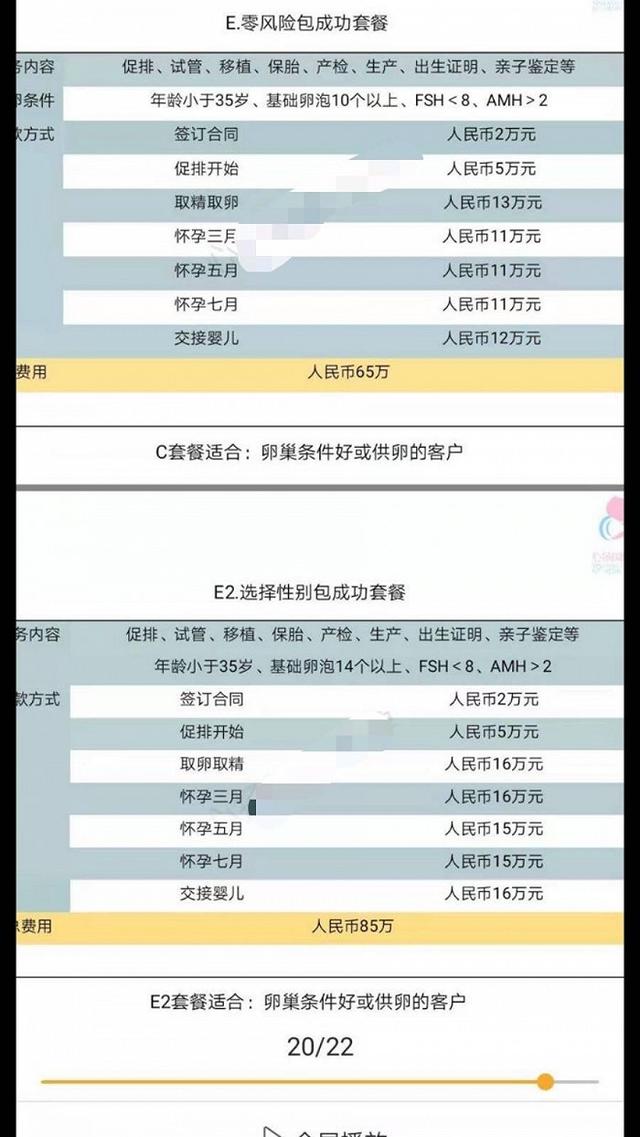 此造成代孕市场收费较为混乱。一般情况下,挑选卵子价格为6万元至10万元左右;代孕价格则按照不同档次定价,有不包成功的、包成功的、包生儿子的等,价格从40万元至135万不等。