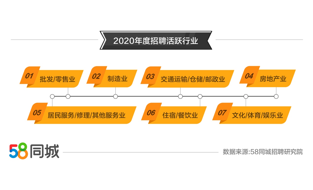 在求职方面,2020年求职需求TOP 3行业为批发/零售业、制造业、交通运输/仓储/邮政业,招聘求职需求相对平衡。各行业求职需求趋于一致,3-4月节后复工叠加疫后返工,劳动者求职需求大量释放;在7月的年中求职季,求职需求达到全年第二个小高峰。