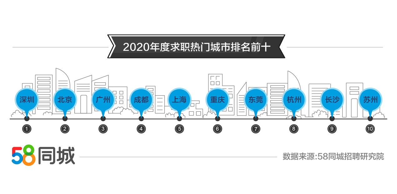 求职方面,2020年,深圳、北京、广州、成都、上海、重庆、东莞、杭州、长沙、苏州位居求职热门城市TOP 10。其中,成都、重庆、东莞、杭州、长沙求职需求释放最早,在3月份表现为同比上升,成都、重庆、长沙同比增速在20%以上,东莞、杭州同比增速超过15%。由于东莞地处人流密集的珠三角城市群,而长沙临近长江中游城市群,这两大城市都因地缘效应吸引了城市群求职人群,求职需求快速增长。