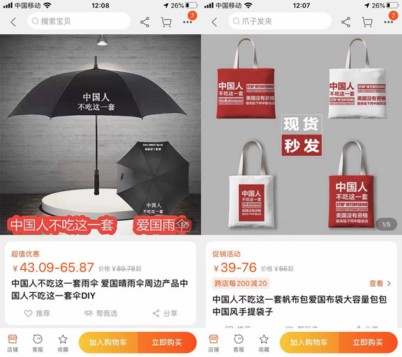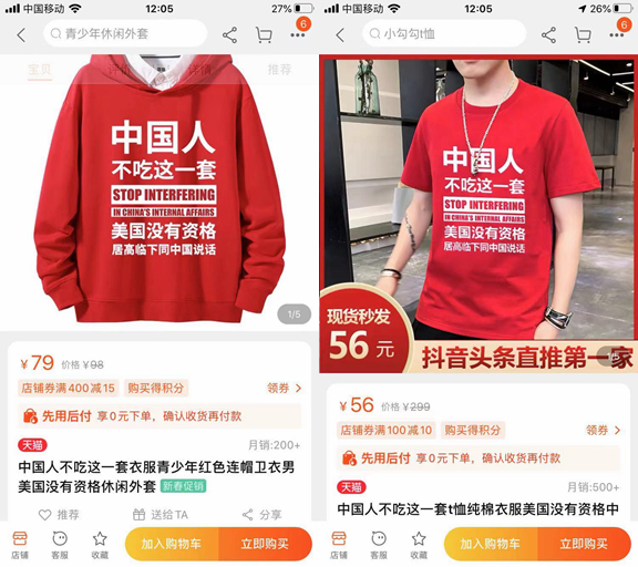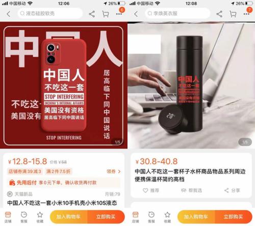 近日,中新经纬记者在各大电商平台搜索“中国人不吃这一套”相关词汇,T恤衫、卫衣、手机壳、手提袋、水杯等一系列应有尽有。