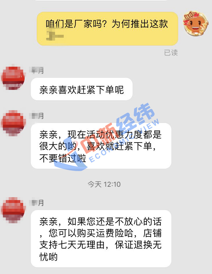 22日中午,中新经纬记者联系其中一家电商客服,客服称:“喜欢就赶紧下单,现在优惠力度很大,不要错过。”几分钟后,客服又补充道:“如果不放心的话,您可购买运货险,支持七天无理由退货”。随后卖家客服还发来15元购物券。