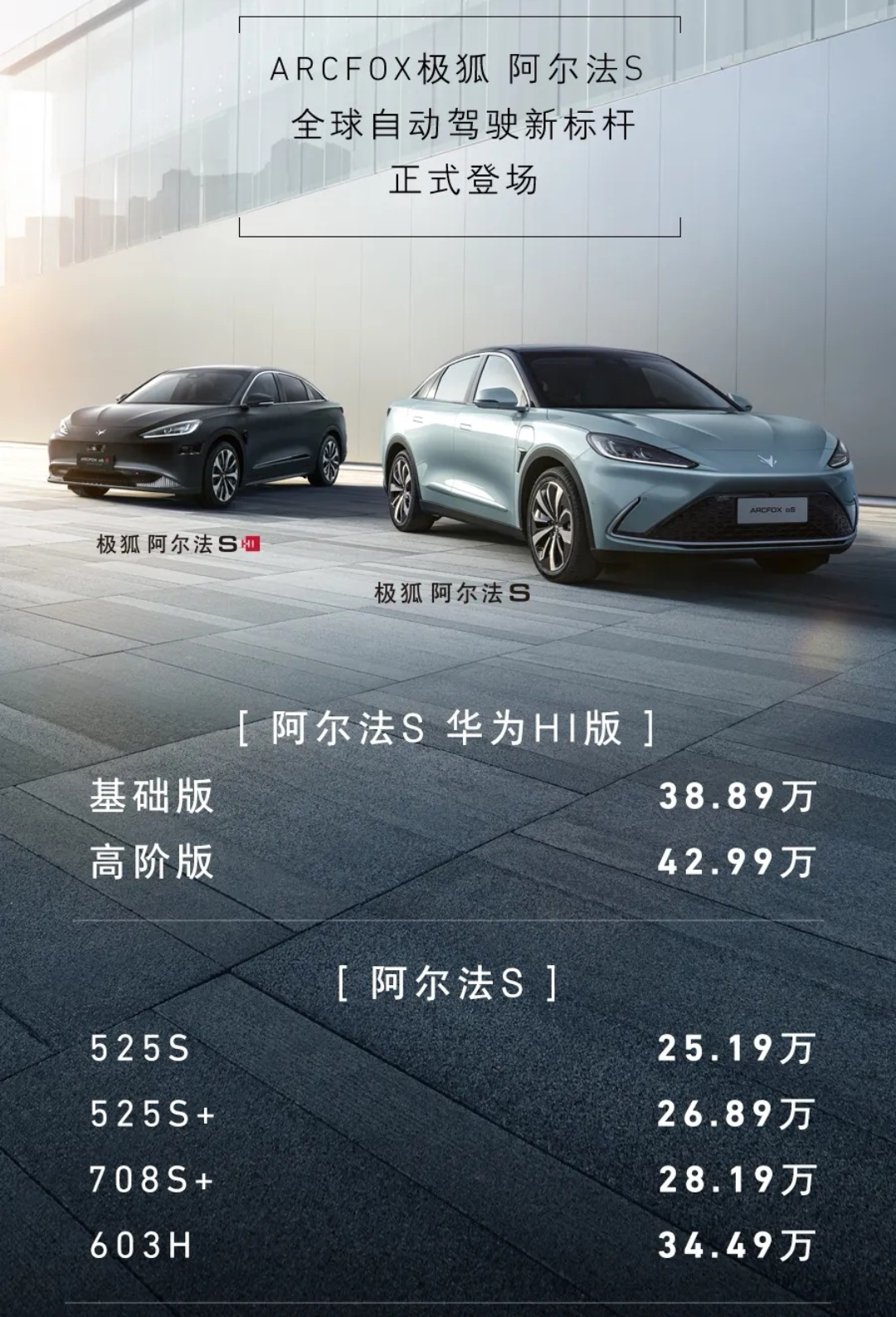4月17日晚,ARCFOX极狐与华为共同打造的极狐阿尔法S 华为HI版正式发布,预售价为基础版38.89万,高阶版42.99万。