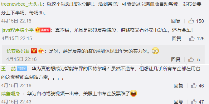 对于华为此次公开亮相的自动驾驶技术,不少网友高度点赞,有网友表示,越复杂的路段,越能体现出华为的实力。还有网友称,“华为真的想成为智能车界的英特尔吗?虽然不造车,但想让几乎所有车企都在用它的这套智能车制造方案。