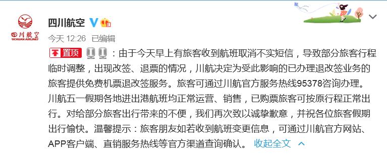 当日中午,四川航空再次表示,由于今天早上有旅客收到航班取消不实短信,导致部分旅客行程临时调整,出现改签、退票的情况,川航决定为受此影响的已办理退改签业务的旅客提供免费机票退改签服务。旅客可通过川航官方服务热线95378咨询办理。川航五一假期各地进出港航班均正常运营、销售,已购票旅客可按原行程正常出行。