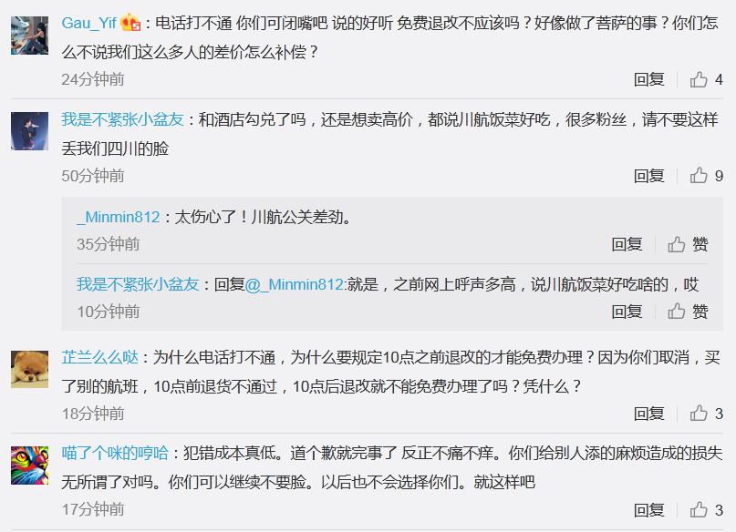 值得一提的是,对于此次川航的免费退改签措施,不少网友并不买账,并质问为何无法打通川航的电话。“打的通吗?”“电话一直打不通,我早上六点在四川航空小程序里查询也是航班取消,你自己的问题。”