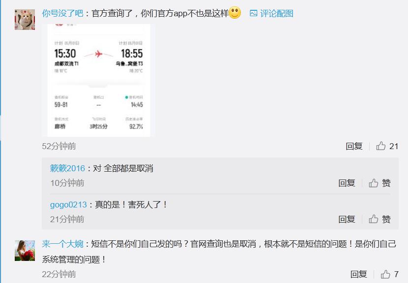 一位网友吐槽:“短信不是你们自己发的吗?官网查询也是取消,根本就不是短信的问题!是你们自己系统管理的问题!”还有一位网友认为,旅客的损失应该由川航承担,不是简单发个通告就可以。