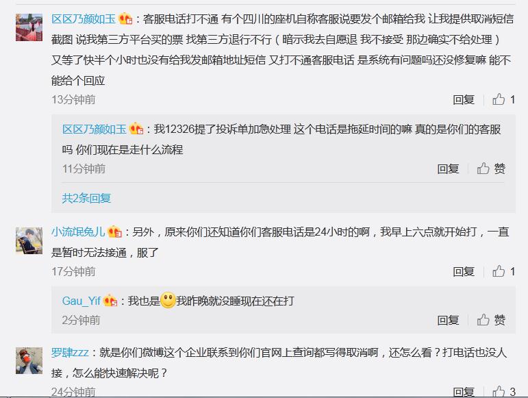 有一位网友自述,“(川航)客服电话打不通,有个四川的座机自称客服说要发个邮箱给我,让我提供取消短信截图,说我第三方平台买的票,找第三方退行不行(暗示我去自愿退我不接受 那边确实不给处理),又等了快半个小时也没有给我发邮箱地址短信,又打不通客服电话。”