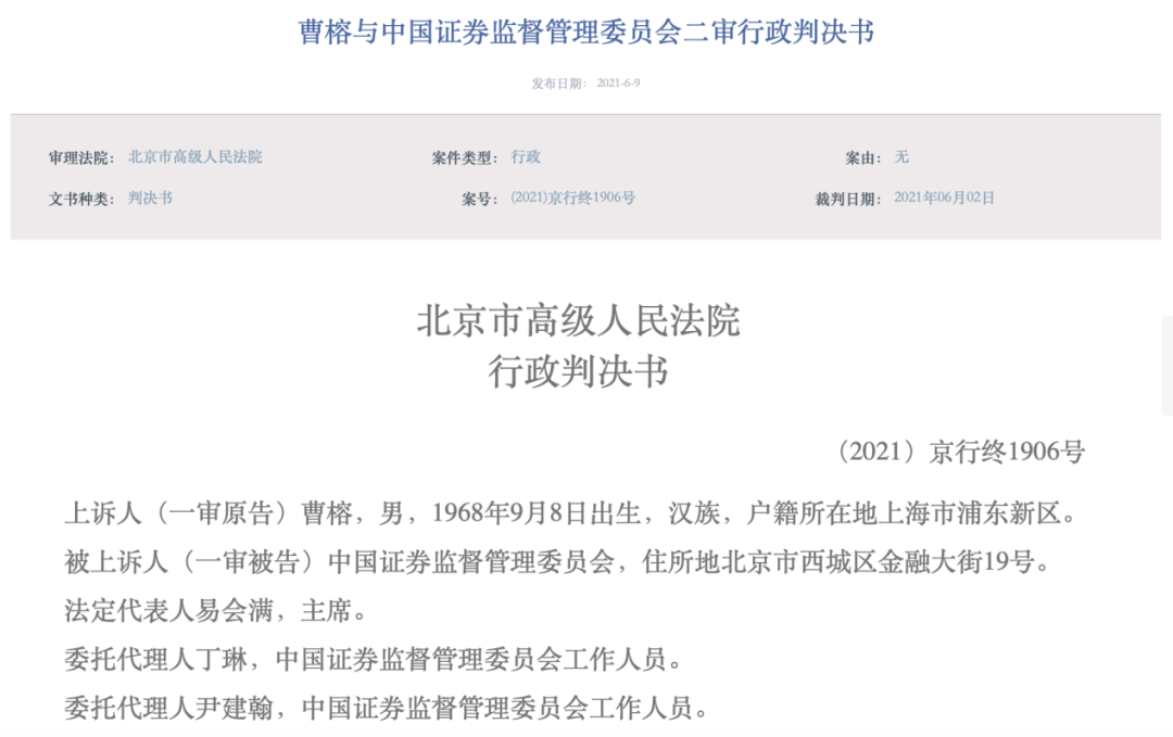 2020年4月,曹榕就市场禁入和警告、罚款及撤销证券从业资格向北京市中级人民法院起诉。