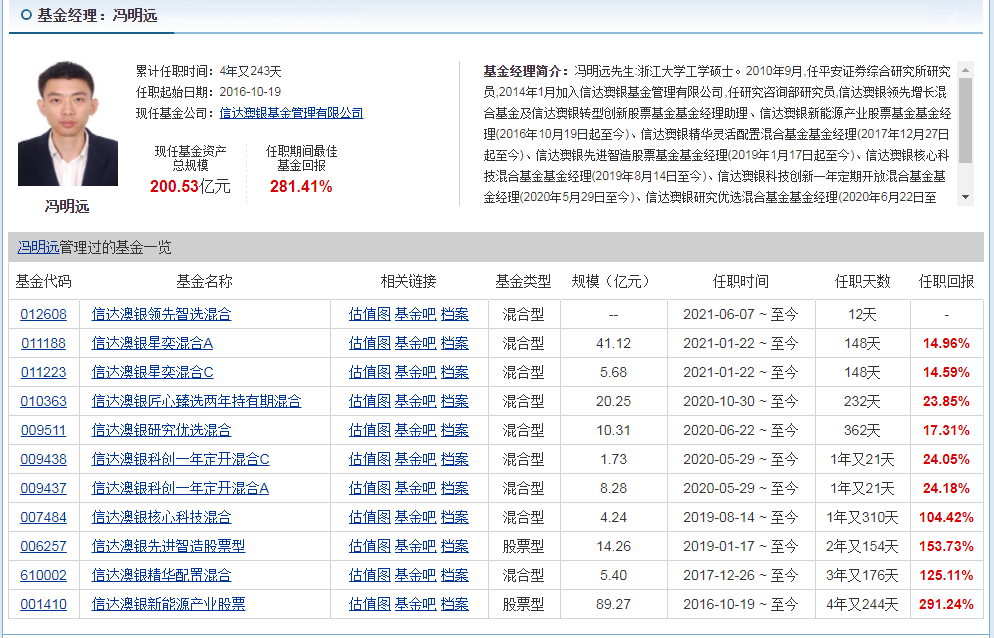截至2021年6月18日,由冯明远担任基金经理的信达澳银新能源基金的净值创出历史新高,累计净值接近4.2元。