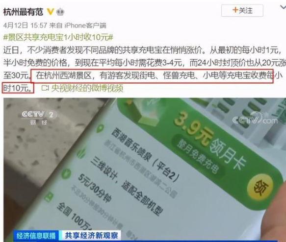 今年4月,有游客在杭州西湖景区内发现共享充电宝的收费高达每小时10元,也引发了一阵舆论关注。有网友评论“用不起”,也有人表示理解,“景区的商品本来就贵,充电宝适当提价也合理”。
