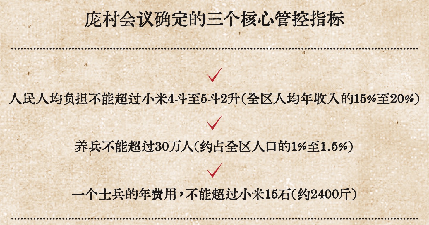 经过充分讨论和大量的反复计算,会议最终找出了三个核心管控指标。“一是人民人均负担不能超过小米4斗至4斗2升(全区人均年收入的15%至20%);二是养兵不能超过30万人(约占全区人口的1%至1.5%);三是一个士兵的年费用,不能超过小米15石(约2400斤)。”马林表示。