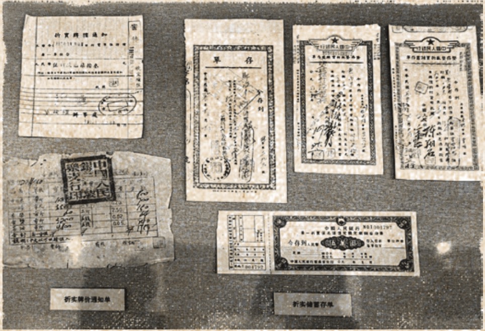 人民银行推出折实储蓄存款,图为折实牌价通知单及折实储蓄存单