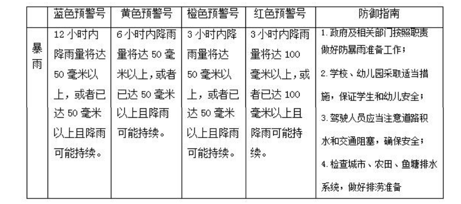 以暴雨预警信号为例,其分为蓝色、黄色、橙色、红色四级。