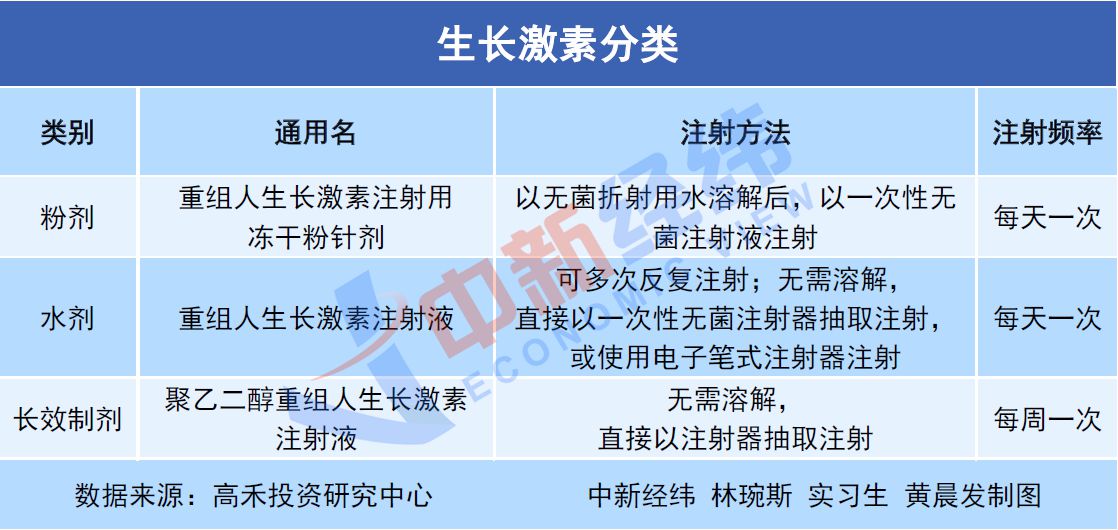 长春高新2020年年报显示,其控股子公司金赛药业生产的生长激素有三种类型,分别为注射用重组人生长激素(粉针剂)、重组人生长激素注射液(水针剂)、聚乙二醇重组人生长激素注射液(长效水针剂)等人生长激素系列产品。