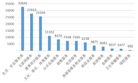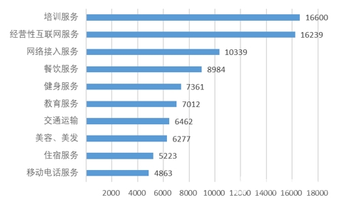 在具体服务投诉中,投诉量居前五位的分别为(如图5所示)培训服务、经营性互联网服务、网络接入服务、餐饮服务、健身服务。由于一些培训机构资金链断裂、挪用培训费、师资无法保证,导致相关投诉增加,不少为群体投诉,解决难度大。