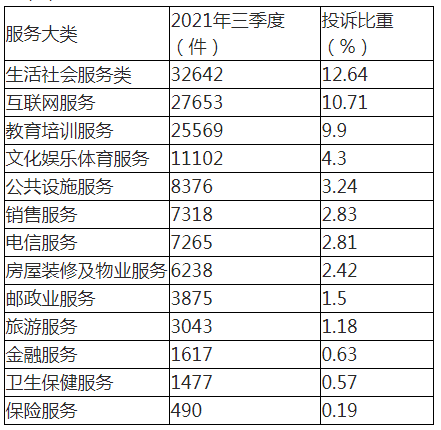 根据2021年三季度服务大类投诉数据(如图3、表3所示),其中生活社会服务类、互联网服务、教育培训服务、文化娱乐体育服务与公共设施服务居于服务类投诉量前五位。