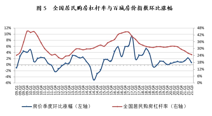 根据报告,比较全国居民购房杠杆率与百城房价指数季度环比涨幅走势发现,房价涨幅与居民杠杆率总体呈现正相关关系。