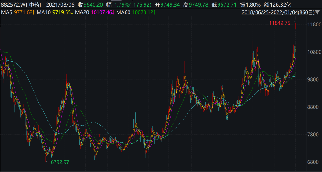 近期,股价持续上涨的中药板块备受资本市场关注。Wind数据显示,在2021年下半年医药板块大幅回调的背景下,中药指数(882572)在2021年逆势上涨近三成,仅在2021年的最后两个月,中药指数就上涨了18%。