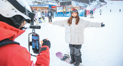 博主在河北崇礼云顶滑雪场录制视频。 新华社记者 吴 壮摄