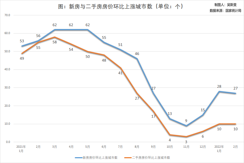国家统计局16日发布2022年2月70个大中城市商品住宅销售价格变动情况的统计数据。数据显示,2022年2月份,全国房价环同比涨幅总体延续去年四季度以来的下降和分化态势。70个大中城市中,一线城市新建商品住宅和二手住宅销售价格环比上涨,二三线城市环比持平或下降;一二线城市商品住宅销售价格同比涨幅回落或持平,三线城市同比下降。