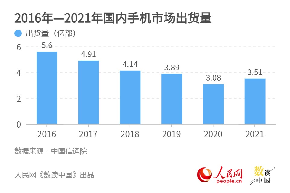 中国信息通信研究院调查显示,国内手机市场总体出货量从2016年的5.6亿部持续下滑至2020年的3.08亿部。2021年手机出货量有所回升,年出货量达3.51亿部。