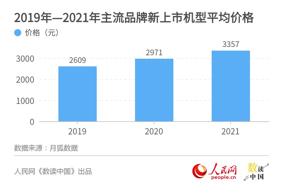 据月狐数据对市场上主流品牌机型价格调查显示,2019年至2021年三年间,主流品牌当年新上市机型平均价格分别为2609元、2971元、3357元,这意味着2020年、2021年的新机型平均价格同比涨幅为14%、13%。