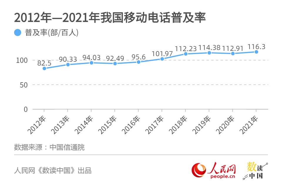 图为2012年至2021年我国移动电话普及率。制图:王仁宏