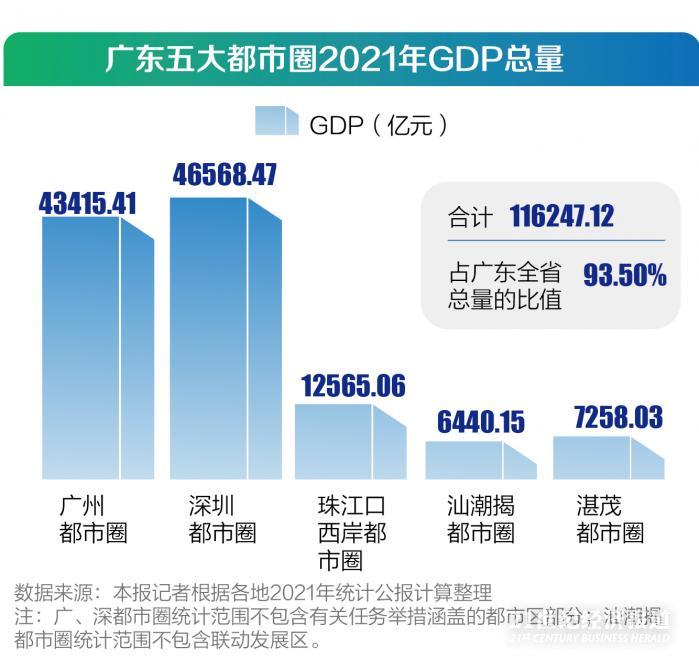 21世纪经济报道记者梳理发现,按照明确划定范围后的都市圈GDP计算,五大都市圈2021年GDP总量占广东省GDP总量的比重约为93.5%。其中,广、深都市圈GDP总量超过4万亿元,广州、深圳不仅对各自都市圈的发展产生了明显的带动作用,对五大都市圈整体的发展也起到了辐射作用。相比之下,珠江口西岸、汕潮揭、湛茂都市圈核心城市的功能作用仍待发挥。