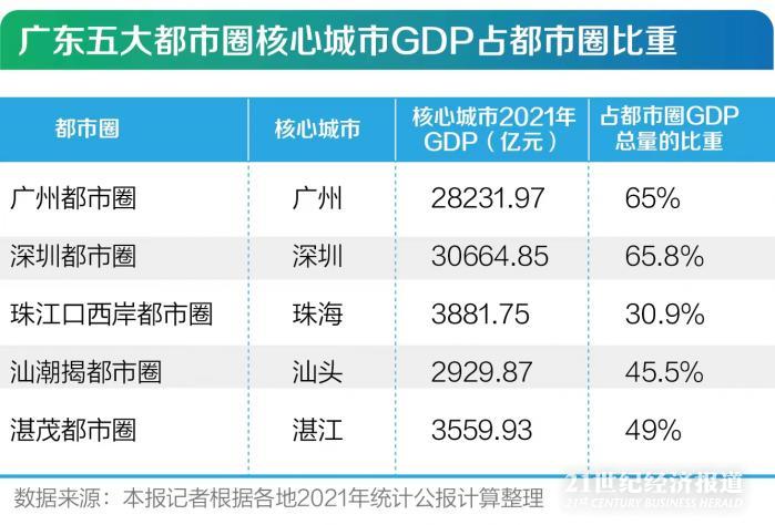 21世纪经济报道记者梳理发现,广州、深圳、珠江口西岸、汕潮揭、湛茂都市圈中核心城市占都市圈GDP的比值依次为65%、65.8%、30.9%、45.5%、49%。