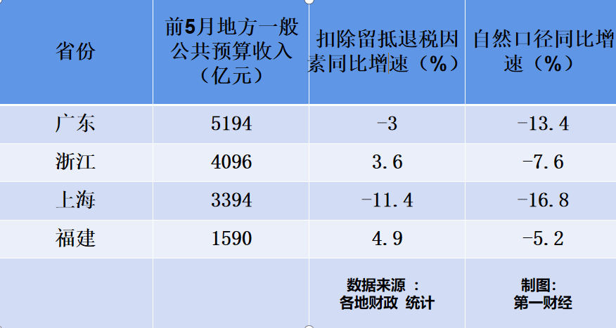 扣除留抵退税因素更能反映地方财政经济运行情况。前5个月,福建、浙江扣除留抵退税因素后,地方一般公共预算收入出现增长。广东、上海等则出现下滑。
