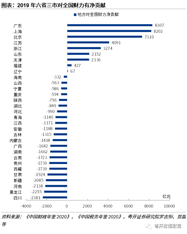 “从净贡献看,广东、上海、北京、江苏、浙江、山东、天津、福建、辽宁共六省三市对国家财政有净贡献,其余省市均需要中央财政给予净补助。对全国财力有净贡献的省份主要集中在东部沿海地区,经济相对发达。其中,广东、上海、北京为第一梯队,遥遥领先。中央对中西部地区转移支付规模大,成为中西部省份财政收支差的主要弥补来源。”罗志恒说。