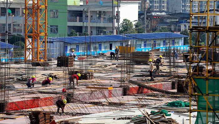 2020年3月20日,工人在位于贵州省仁怀市苍龙街道的仁怀市易地扶贫搬迁产业基础设施项目工地施工。图片来源:人民视觉