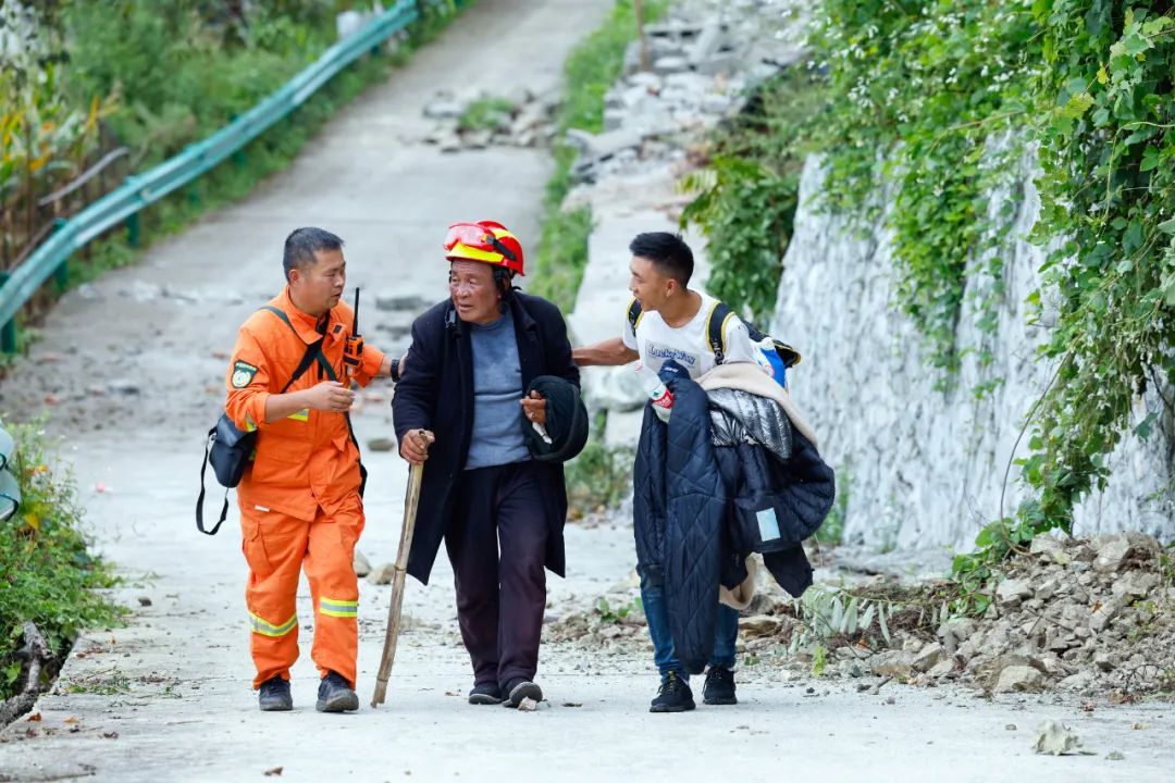 9月6日,救援人员护送从泸定县得妥镇湾东村疏散出来的村民。新华社记者 沈伯韩 摄
