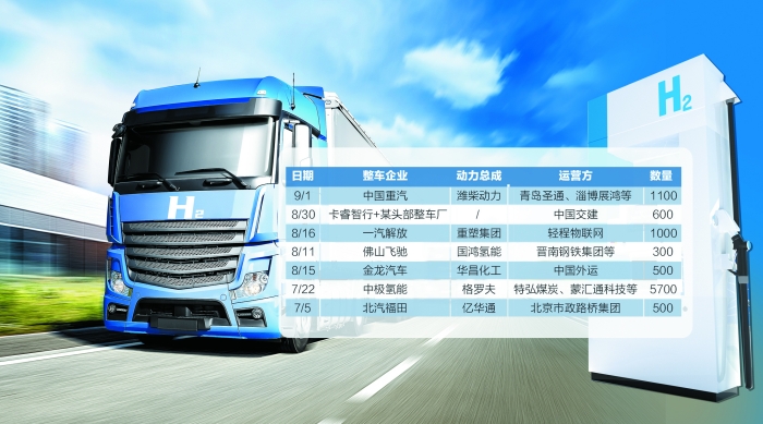 据统计,自今年7月以来,已公开的氢能重卡订单数已达到10000台,涉及的整车企业包括潍柴动力、中国重汽、一汽解放、北汽福田、佛山飞驰等,运营方包括中国交建、中国外运、中国电建、北京市政路桥建材集团等。