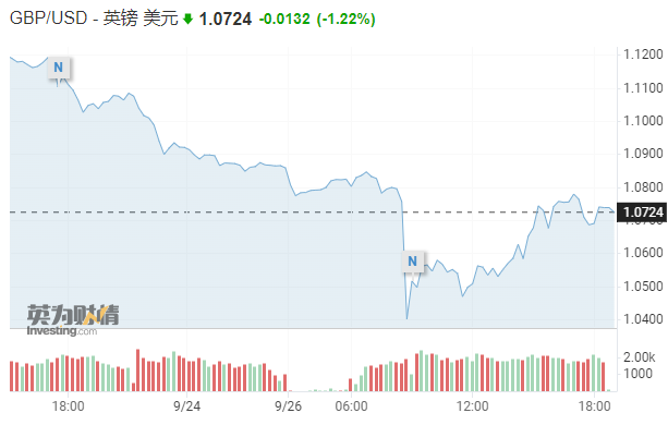 9月26日,英镑兑美元继续下跌,一度跌破1.04美元,创下了纪录新低。此前英镑/美元的纪录低点是在1985年创下的1.05美元左右。