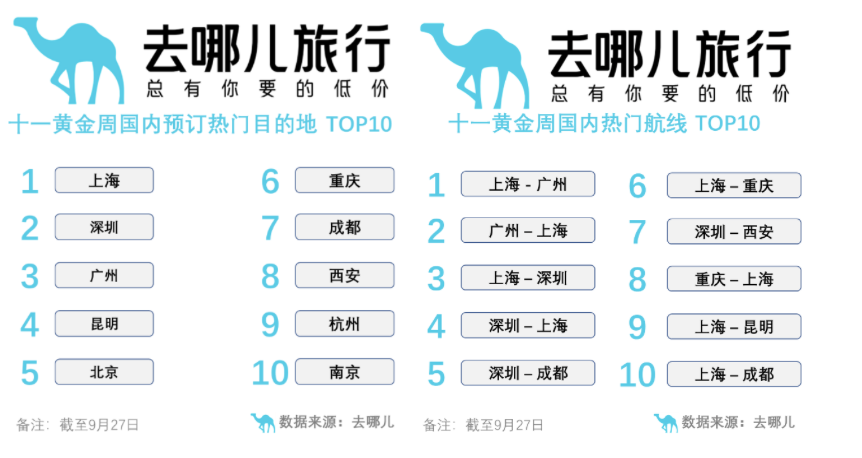 在去哪儿平台上,上海、深圳、广州、昆明、北京、重庆、成都、西安、杭州和南京是十一期间热门目的地TOP10。
