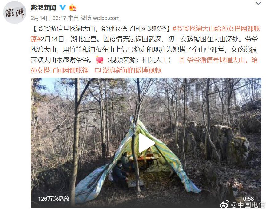 然而,在多数孩子享受着网课的便利之时,还有一部分孩子为上课费尽周折。在内蒙古呼伦贝尔,有一户世代生活在草原的牧民,为了让女儿顺利上网课,不得不收拾蒙古包全家迁徙找网;在湖北宜昌,一位爷爷拿着手机循信号找遍大山,给孙女搭了一间网课帐篷;在河南洛宁县,一位高三女生为跟上网课进度,每天都到村委大院蹭网……