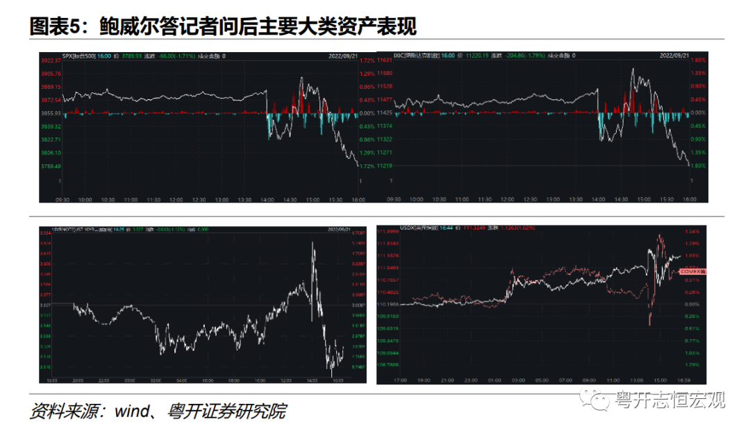 答记者问:鲍威尔讲话基调鹰中有鸽。虽然暗示改变政策立场的可能,但有着严格的要求。虽然坦承加息会带来经济衰退的痛苦,但主张经济增长下滑幅度相对温和。未来美联储加息幅度取决于经济和通胀数据。