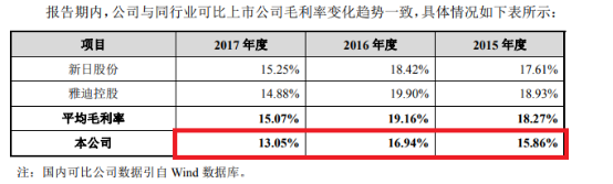 数据显示,2015年-2017上半年,爱玛科技的综合毛利率分别是15.86%、16.94%和13.05%。