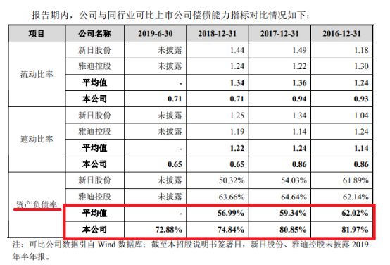 2016年-2018年,同行业可比上市公司资产负债率平均值为62.02%、59.34%、56.99%,而爱玛科技分别为81.97%、80.85%、74.84%。