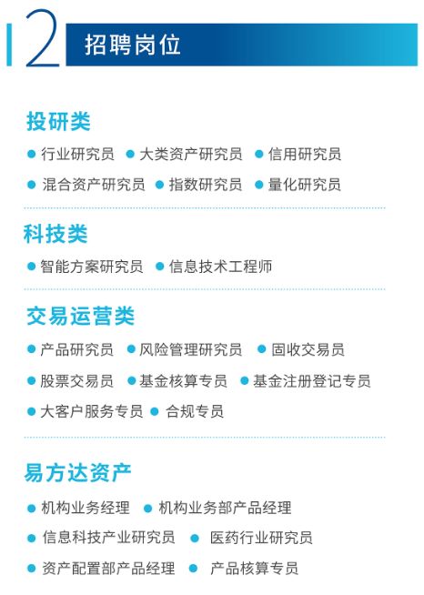 大型公募易方达基金近期启动2020校园招聘,招聘岗位包括投研类的行业研究员、大类资产研究员、信用研究员、混合资产研究员、指数研究员和量化研究员;科技类的智能方案研究员、信息技术工程师;交易运营类的产品研究员、风险管理研究员、固收交易员、股票交易员等。还有易方达资产也招机构业务经理、信息科技产业研究员、资产配置部产品经理等。工作城市选择比较大,包括广州、北京、上海、深圳。