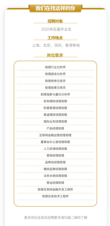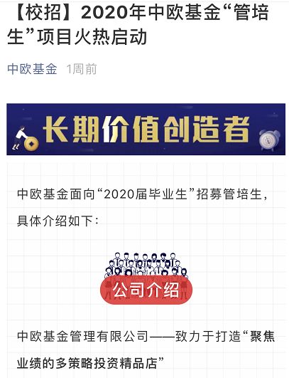中欧基金也发出2020年毕业生“管培生”项目,招聘岗位包括业务发展部产品经理、零售业务部渠道销售、基金运营部基金会计、中央交易室股票/债券交易员、人力资源部人力资源、行政部行政等。
