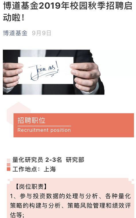 新锐基金公司博道基金在9月启动2019年校园秋季招聘,放出了一大波岗位,包括量化研究员2-3名、行业研究员1-2名、销售经理2-3名、交易员1-2名、注册登记岗1-2名。