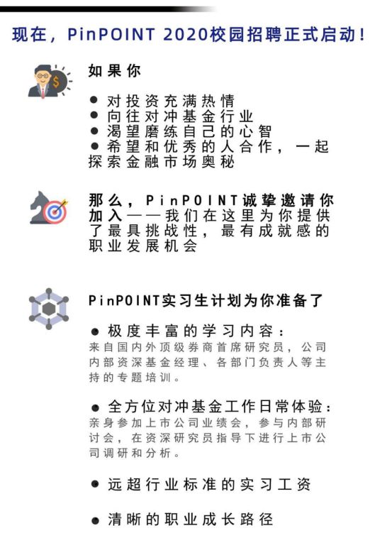 低调的百亿私募上海保银投资(PinPOINT),9月罕见抛出校园招聘计划,面向顶尖大学2020年应届毕业生,主要是招数学、统计、物理、金融工程、计算机、经济金融等相关专业的人才。据介绍,保银投资现在管理35亿美金、拥有70人的专业团队。