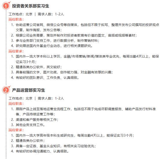 新晋百亿私募拾贝投资也在招人,主要是投资者关系部、产品运营部的实习生,要求国内外一流大学本科以上学历,英文较好,文字功底强等,实习表现好可以直接发offer。