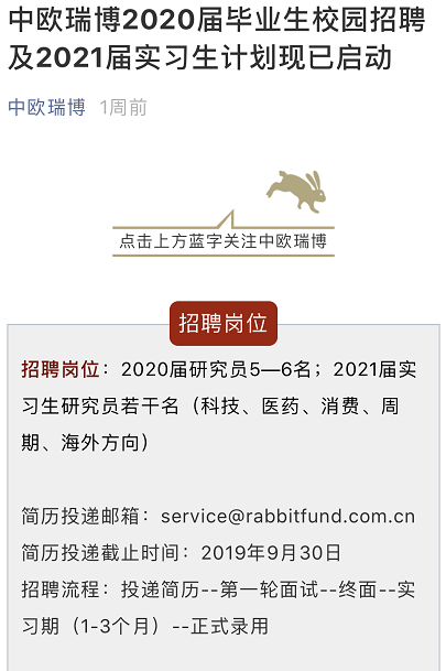 深广地区的知名私募中欧瑞博投资也启动了2020届毕业生校园招聘及2021届实习生计划,招聘岗位包括2020届研究员5、6名,2021届实习生研究员若干名,涉及科技、医药、消费、周期、海外等方向。